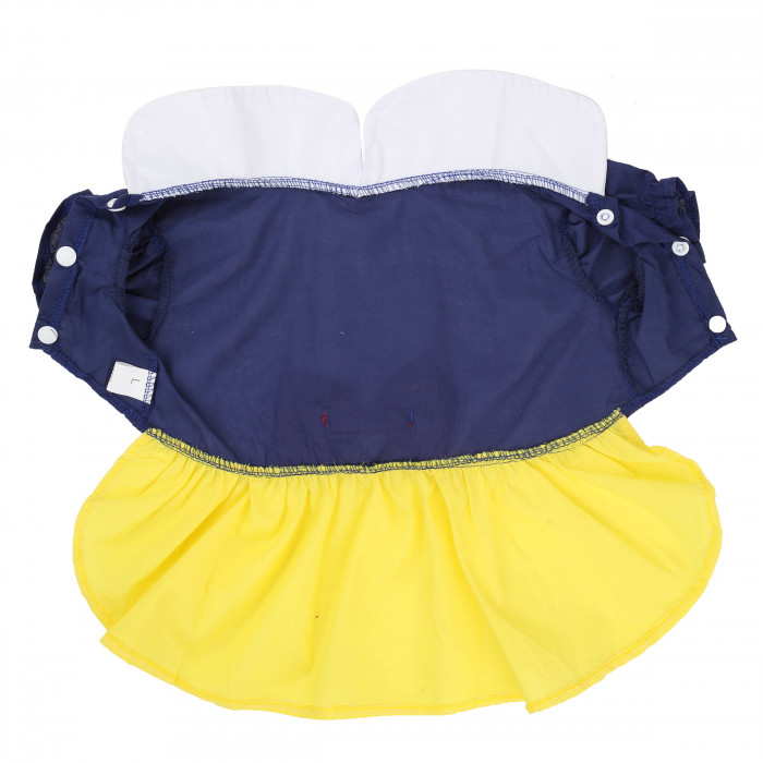 Літня сукня для собак. Такий образ буде виглядати привабливо і гармонійно під час сонячних прогулянок або фотосесій.Дизайн сукні виконаний у темно-синьому кольорі з жовтою спідничкою та червоним метеликом на грудях. Таке поєднання кольорів виглядає стильно та сучасно. А також такий образ додасть яскраву родзинку для будь-якої прогулянки.Сукня виготовлена з якісних матеріалів. Які не вибагливі в догляді і не втрачають колір після декількох прань.