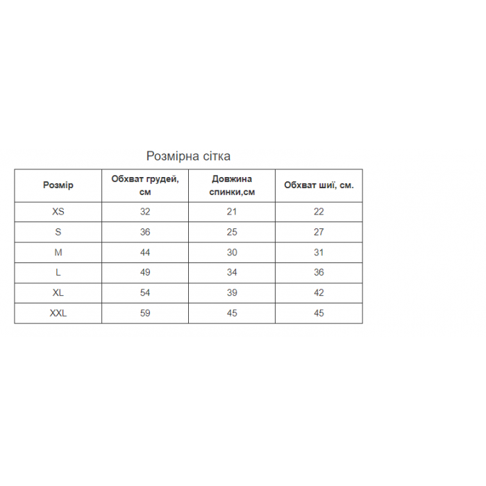 2XL: Обхват грудей – 59 см, Довжина спини – 45 см, Обхват шиї – 45 см.