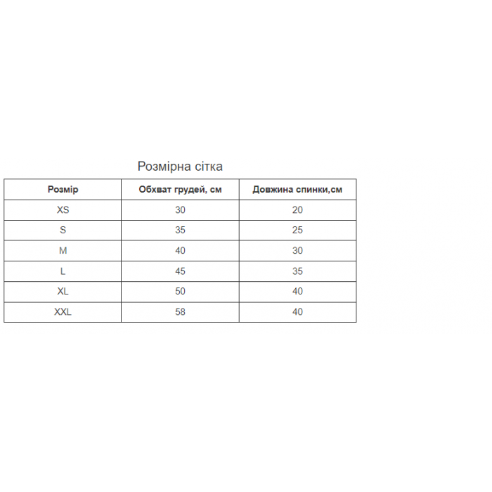 Розмір 2XL: Обхват грудей – 58 см, Довжина спини – 40 см