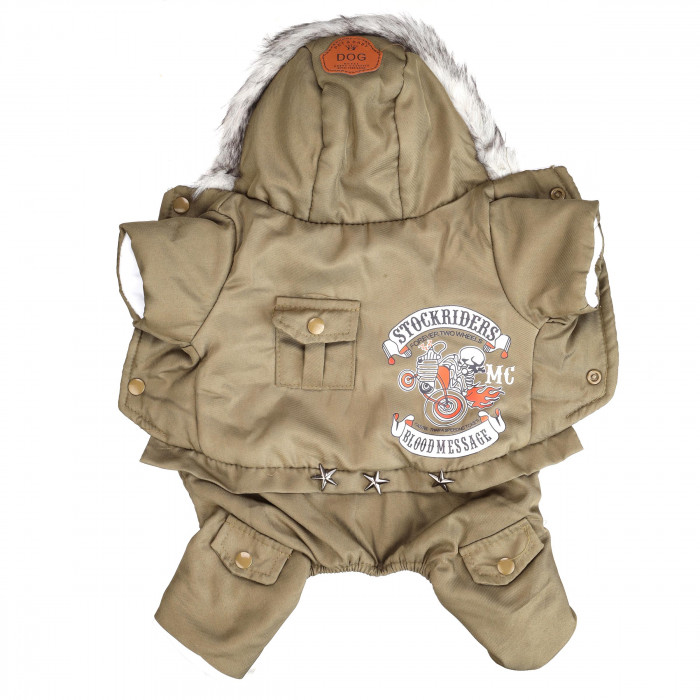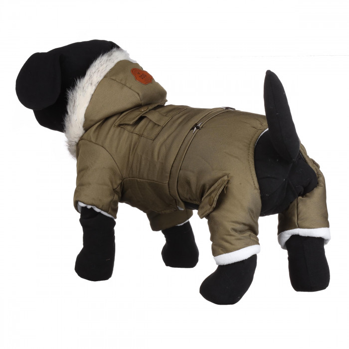 Комбінезон для собак стане гарним доповненням до гардеробу вашого улюбленця Таку річ можна сміливо одягати на щоденні прогулянки в холодну пору року.Комбінезон виготовлений із високоякісних матеріалів, які не вибагливі у догляді та прослужать не один рік за постійного використання.Дизайн комбінезона виконаний у кольорі хакі, також має капюшон, який захистить вуха вашого улюбленця від холоду та вітру. Комбінезон забезпечить зручність не тільки для тварини, а й для господаря, оскільки має зручні застібки.