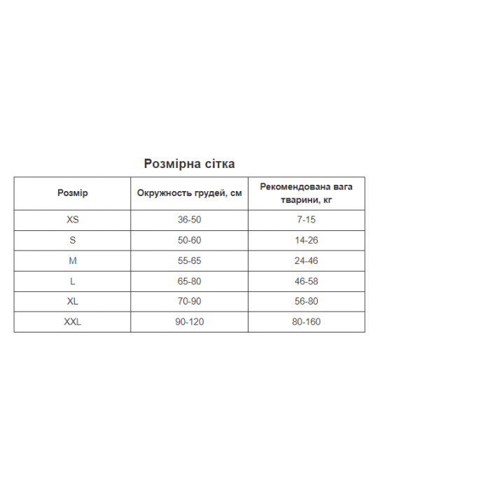 2XL: Обхват грудей – від 90 до 120 см, Рекомендована вага тварини – від 80 до 160 кг.