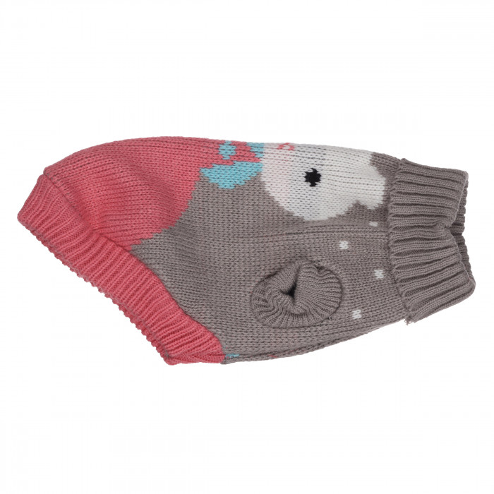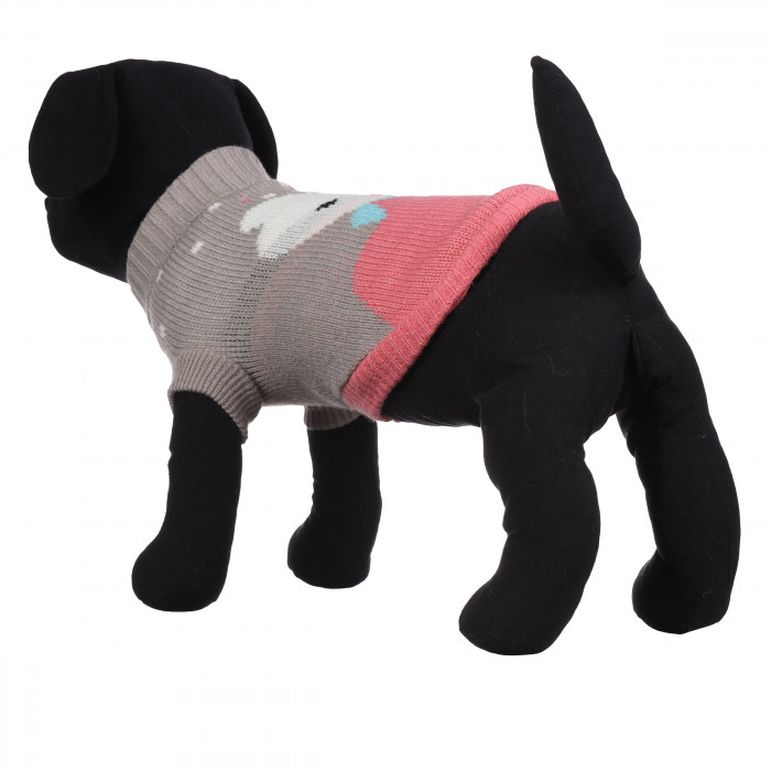 Такой свитер подчеркнет милый характер животного, а также добавит необычную яркую изюминку в стильный образ животного. Вещь изготовлена из качественных тканей, которые прекрасно тянутся и не сковывают движение любимца во время прогулки. За счет этого песик чувствует себя уверенно и комфортно. Дизайн данного аксессуара выполнен в милой тематике с узором серого зайчика на спинке животного.