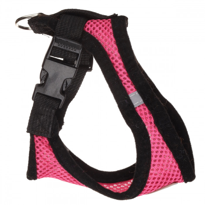 Нагрудна шлейка для собак у темно-рожевому кольорі з повідцем. Дизайн цього аксесуара виконаний у рожевому кольорі з чорною окантовкою. Річ виготовлена з м'якої високоякісної сітки, яка прекрасно пропускає повітря і не подразнює шкіру тварини. Цей аксесуар забезпечить більш чіткий контроль над вашим улюбленцем і допоможе в дресируванні. Шлею також можна використовувати для щоденних прогулянок, оскільки вона створює менше навантаження, ніж нашийник.