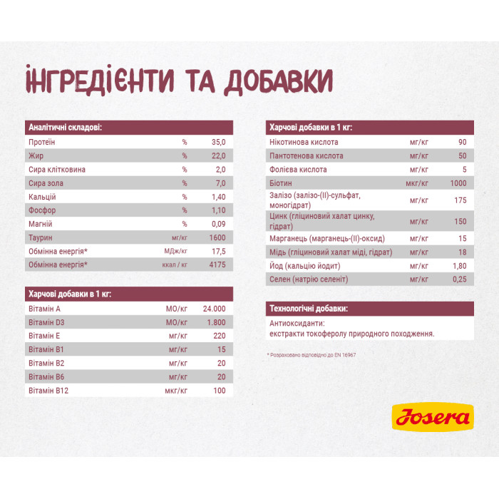 Josera Kitten — це повноцінний раціон для кошенят з 2 місяців до 1 року, а також для вагітних і лактуючих кішок. Формула з високим вмістом білка та енергії забезпечує здоровий розвиток м’язів, імунної системи та внутрішніх органів на всіх етапах росту.
