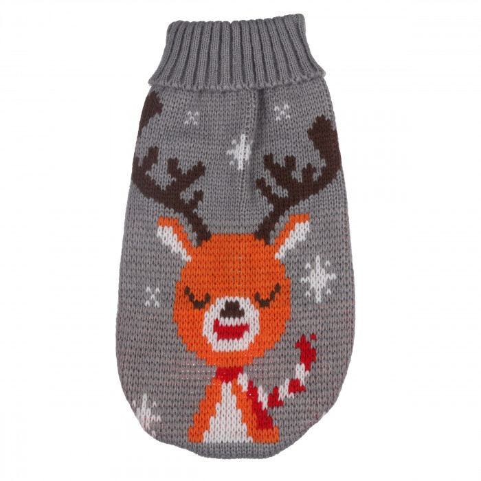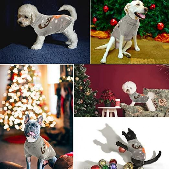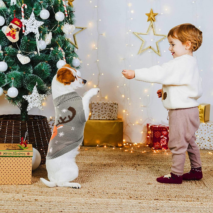В'язаний акриловий светр для собак ідеально підходить для холодної пори року, забезпечуючи вашому улюбленцю тепло і комфорт. Його дизайн виконаний у сірому кольорі з візерунком оленя, що надає особливого святкового шарму. У такому светрі ваш улюбленець стане частиною новорічної казки, що ідеально пасує для новорічних свят і різдвяних вечерь.